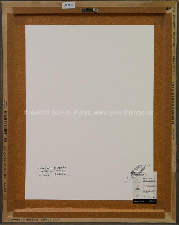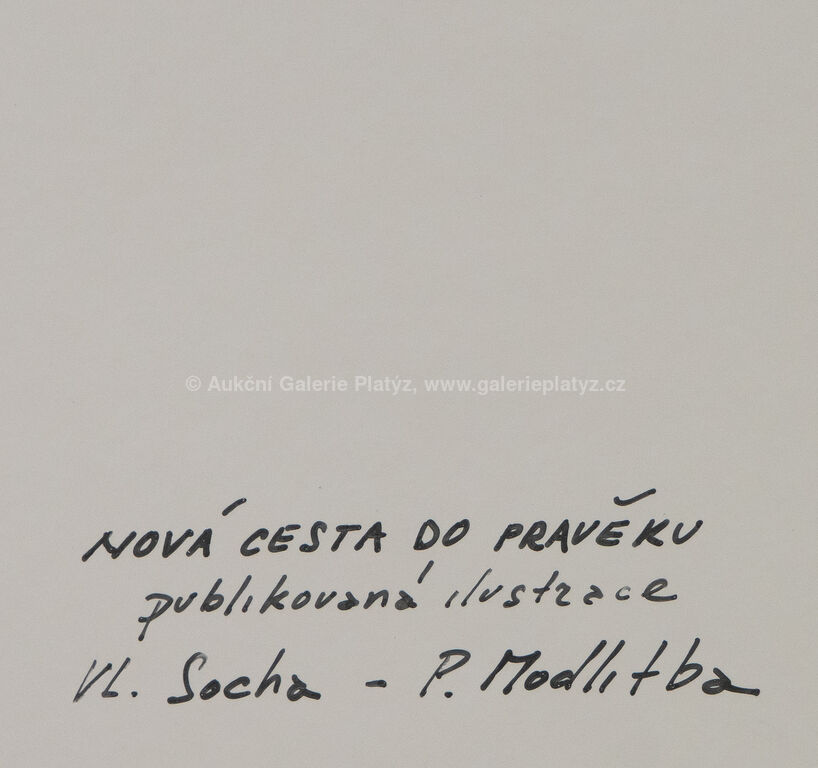 kvaš/papír, rozměr ve výřezu 39 x 28 cm, značeno a datováno vpravo dole, paspartováno, zaskleno muzeálním sklem, rámováno, publikováno v knize Nová cesta do pravěku, Vl. Socha, P. Modlitba