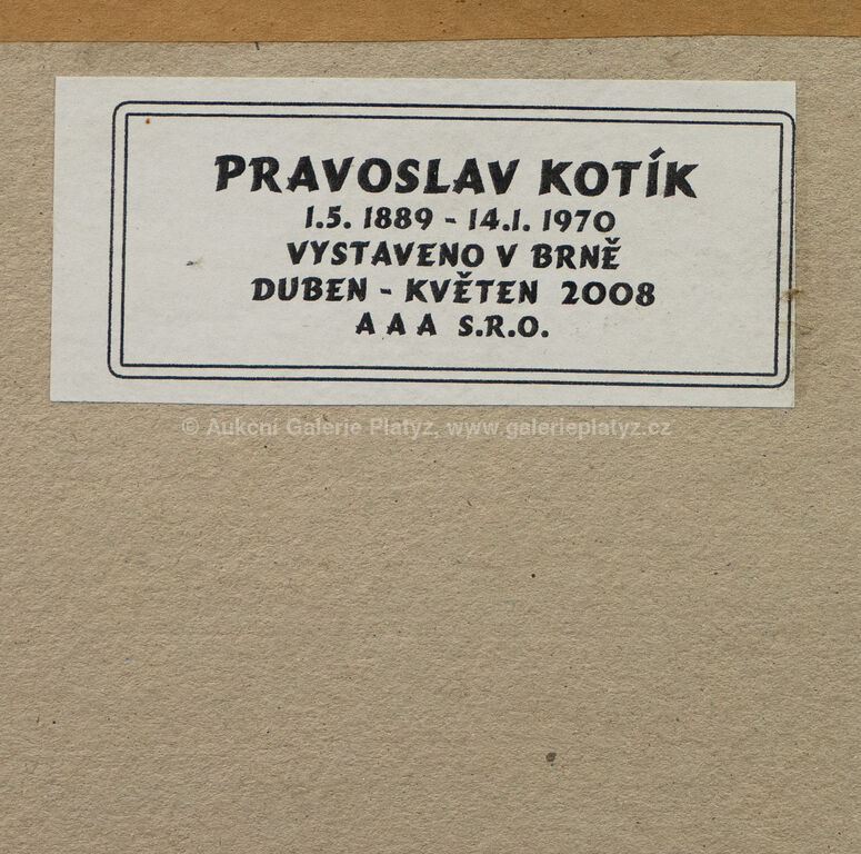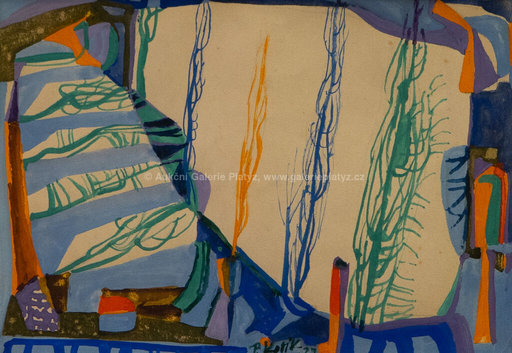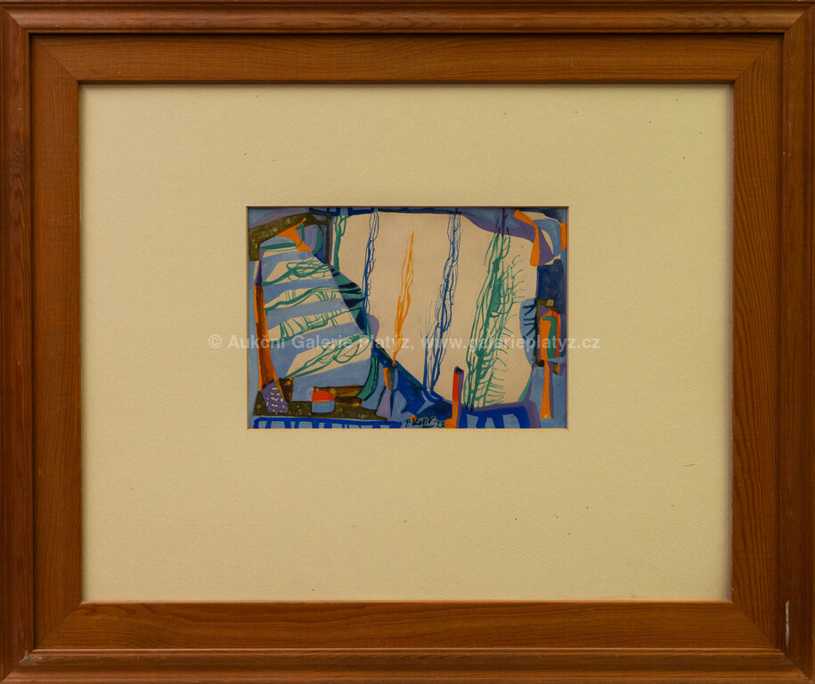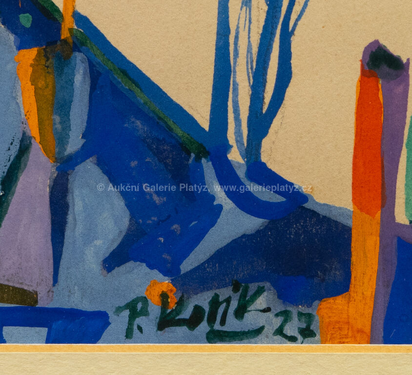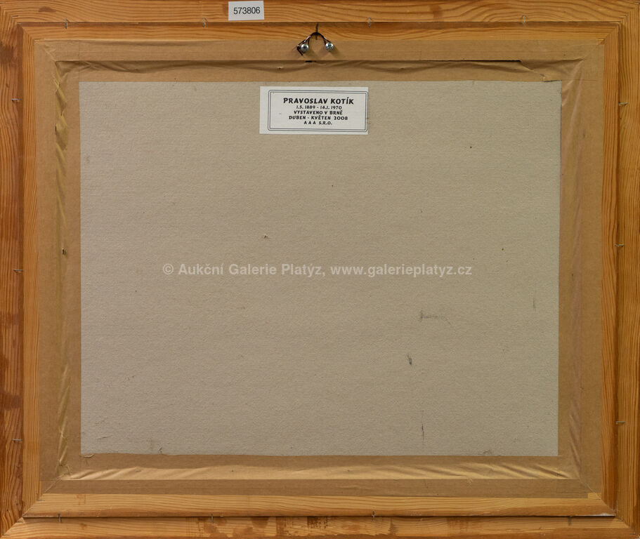 tempera/papír, rozměr ve výřezu 16,5 x 24 cm, značeno a datováno ve spodní části, paspartováno, zaskleno, rámováno, publikováno v monografii Pravoslav Kotík, práce na papíru, kresby, malby hlavně z 60. let 20. stol., č. 18, 1938 - 56