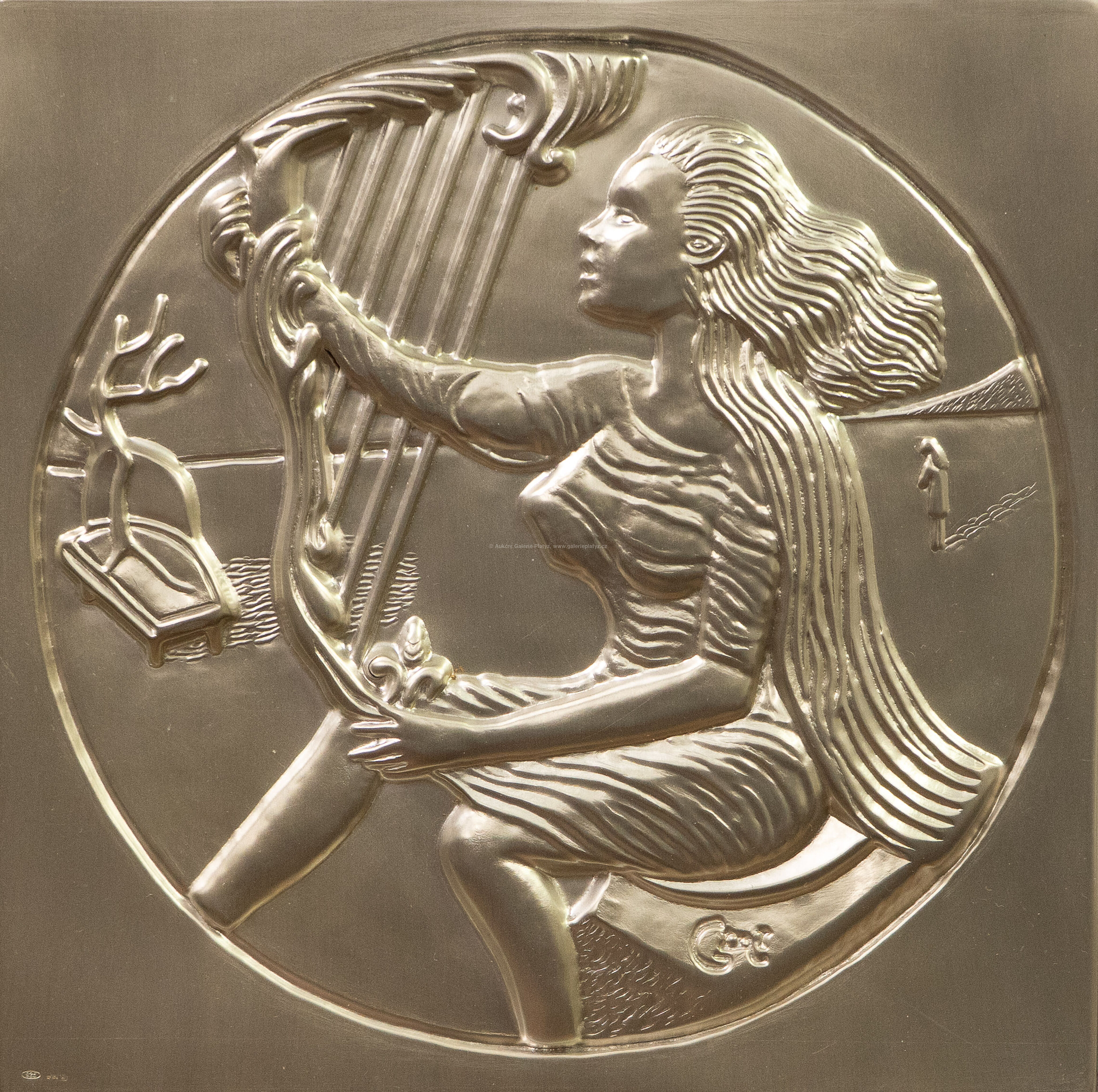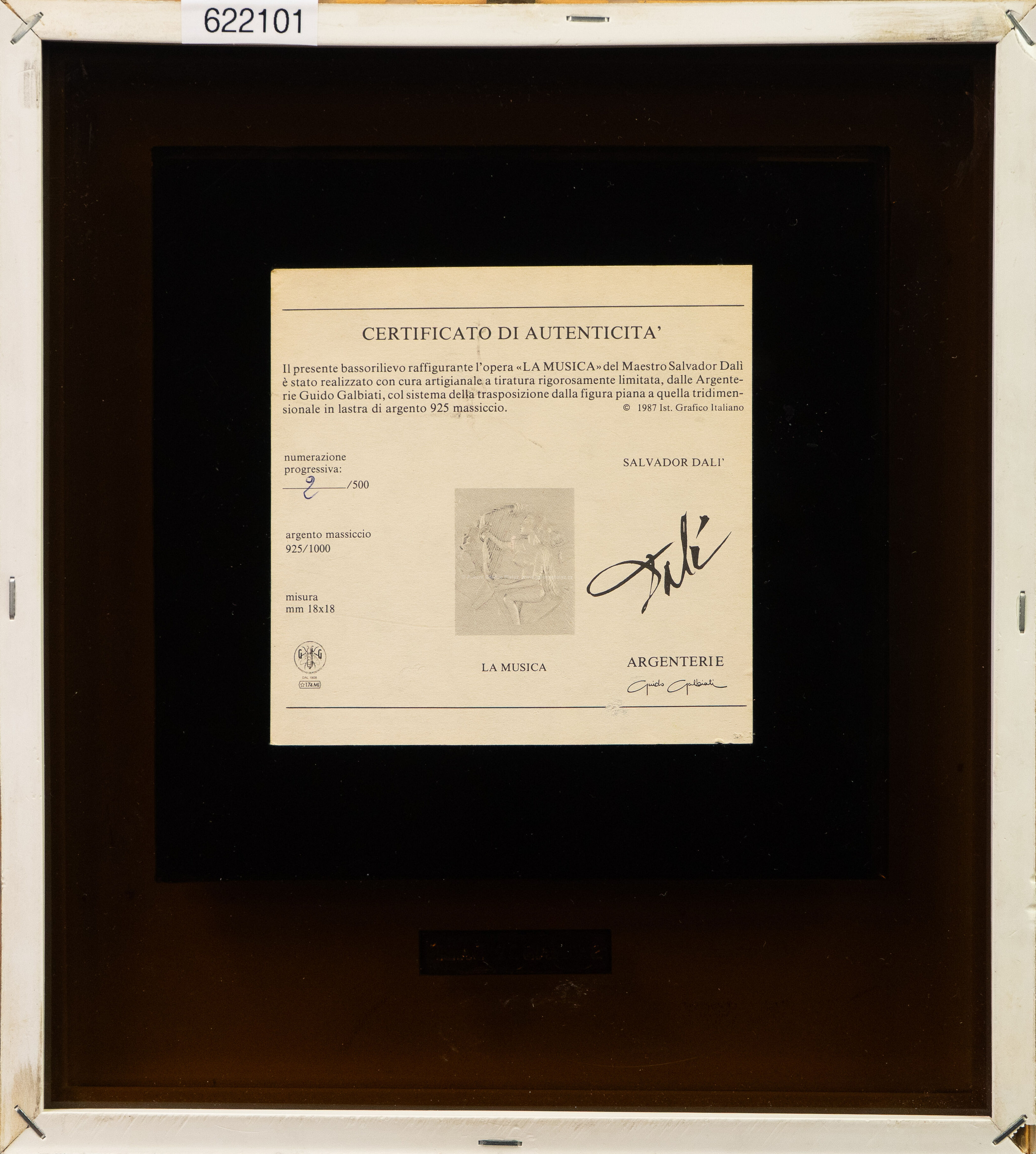 stříbrný reliéf, rozměr reliéfu 18,5 x 18,5 cm, hmotnost 108,43 g, ryzost 925/1000, rámováno v kazetě, limitovaná edice, přiloženo Osvědčení puncovního úřadu o ryzosti a hmotnosti objektu