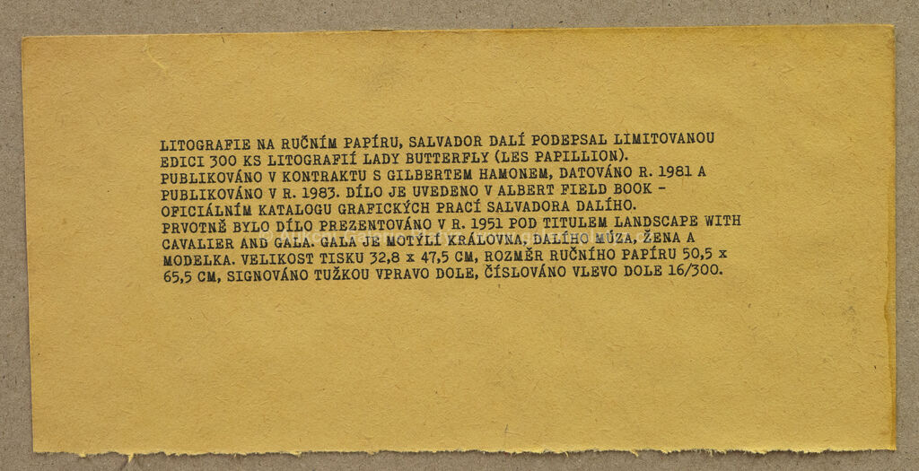 litografie/ruční papír, rozměr listu 50 x 66 cm, značeno a číslováno ve spodní části, zaskleno, rámováno, A.Field: "The Official Catalogue of the Graphic Works of Salvador Dalí"