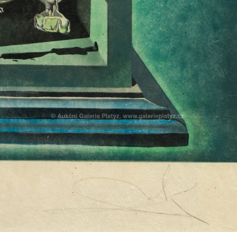 litografie/papír, rozměr ve výřezu 79,5 x 58,5 cm, značeno a popsáno ve spodní části, paspartováno, zaskleno, rámováno, reference Albert Field str. 250, originální olejomalbu tohoto díla, resp. jeho první verze, daroval Salvador Dalí během své osobní návštěvy papeži Piu XII.