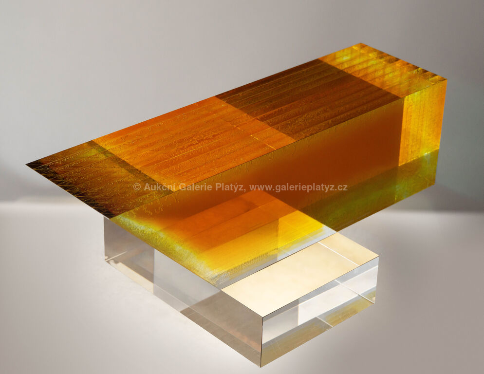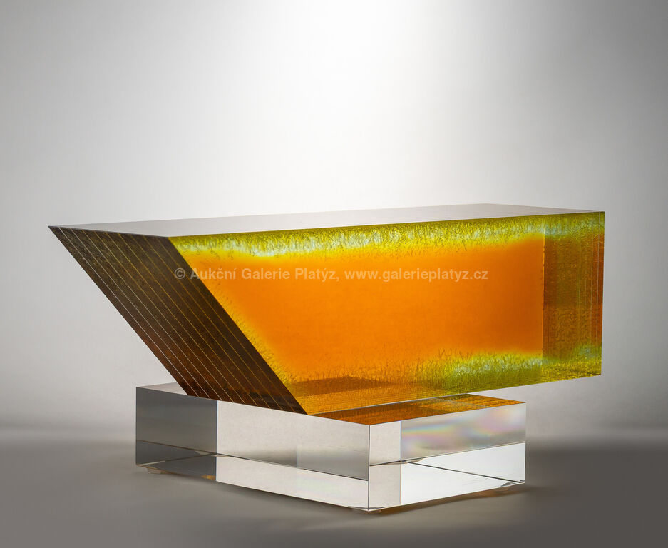 sklo čiré, tabulové, lepené, žlutě tónované, broušené a leštěné, rozměr 15,5 × 36,5 × 20 cm, drobné škrábance na podstavě, vznik 1981, autorská práce, unikátní model, přiloženo Potvrzení pravosti vystavené autorem