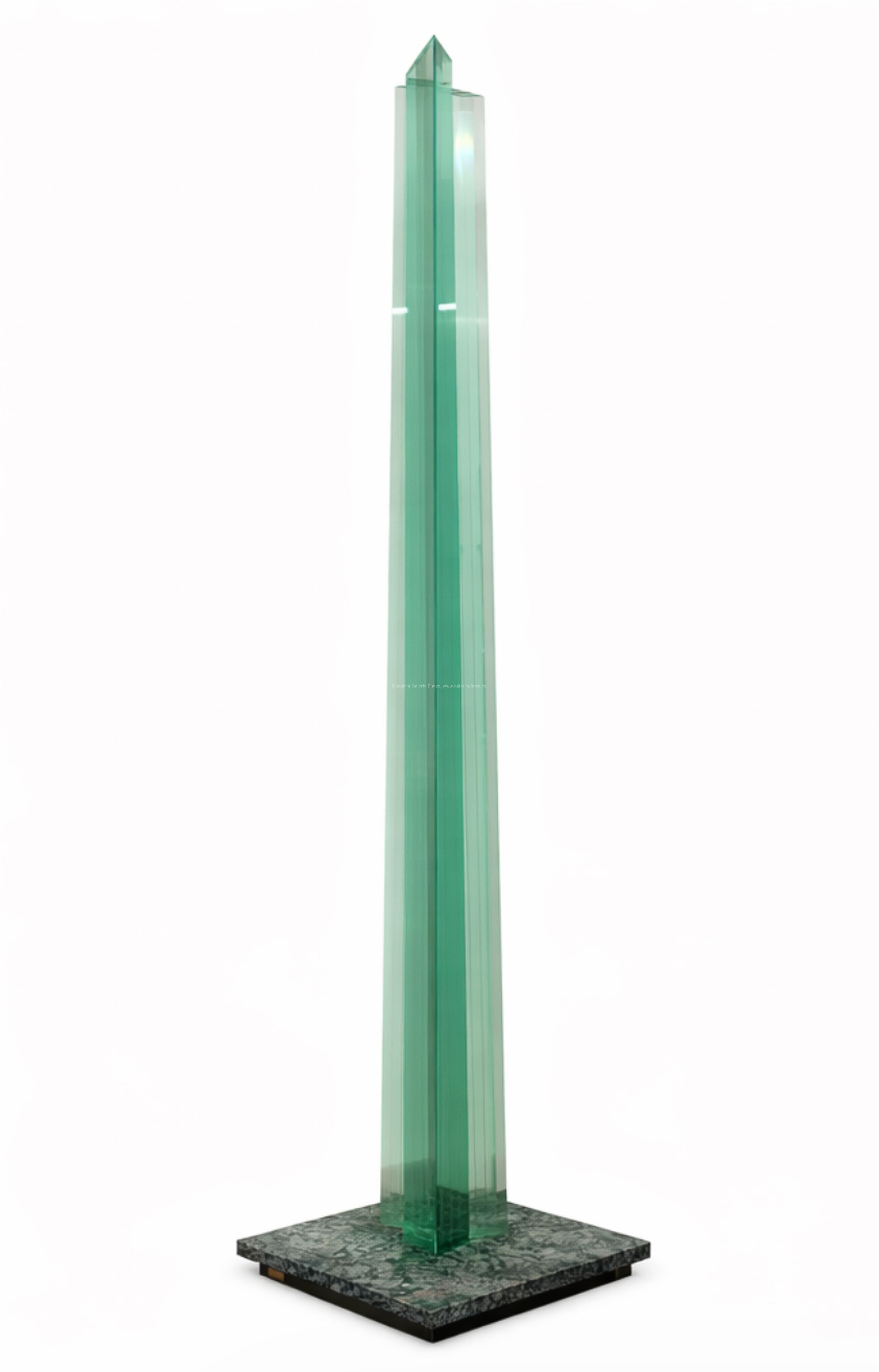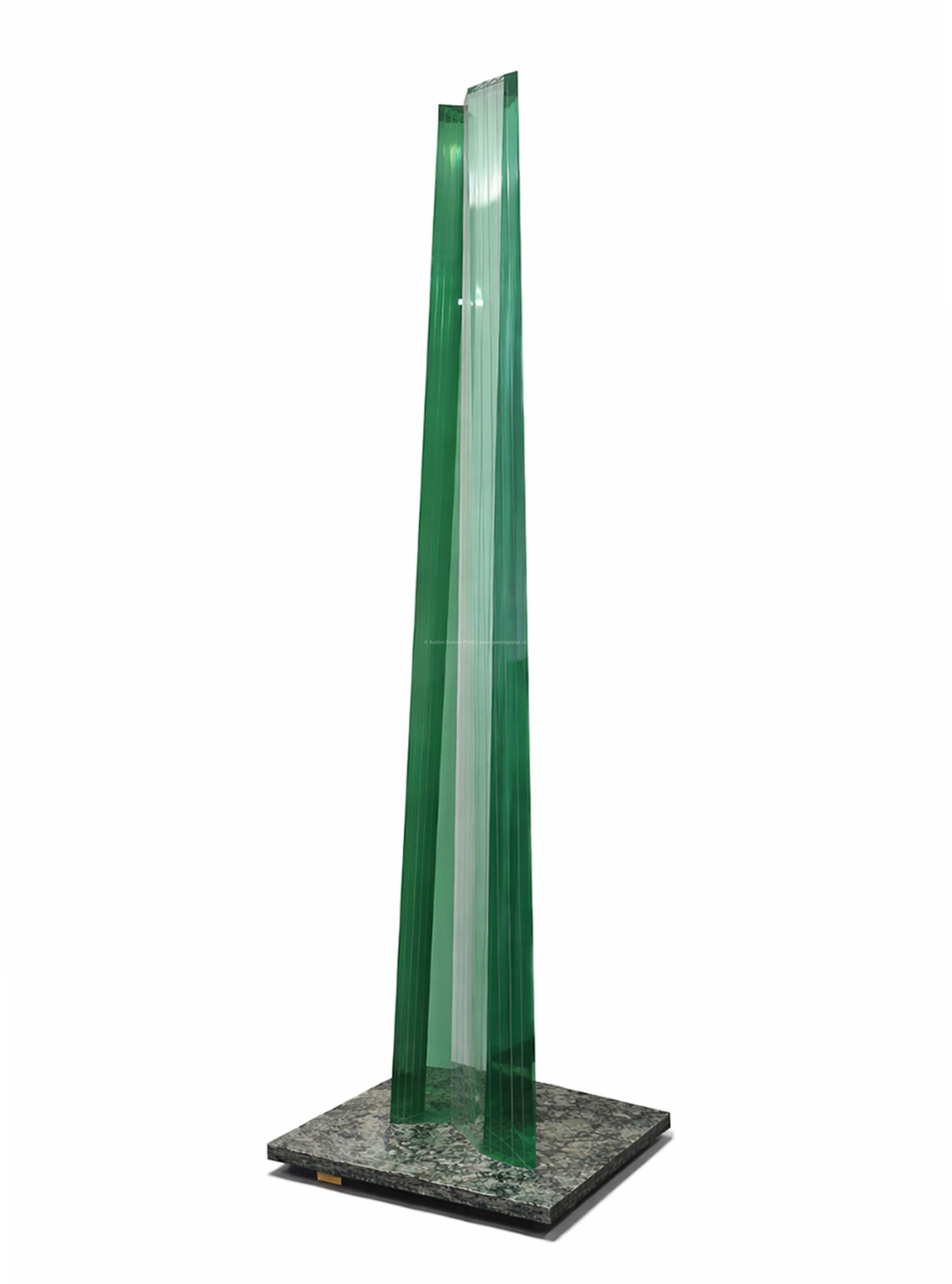 skleněná plastika, vrstvené broušené skleněné desky, celková výška 233 cm, rozměr plastiky 230 x 38 x 40 cm, rozměr podstavce 60 x 60 cm, neznačeno, na několika místech drobné oťuky, publikováno v monografii Vladimír Kopecký, vyd. GHMP v roce 1999, str. 148