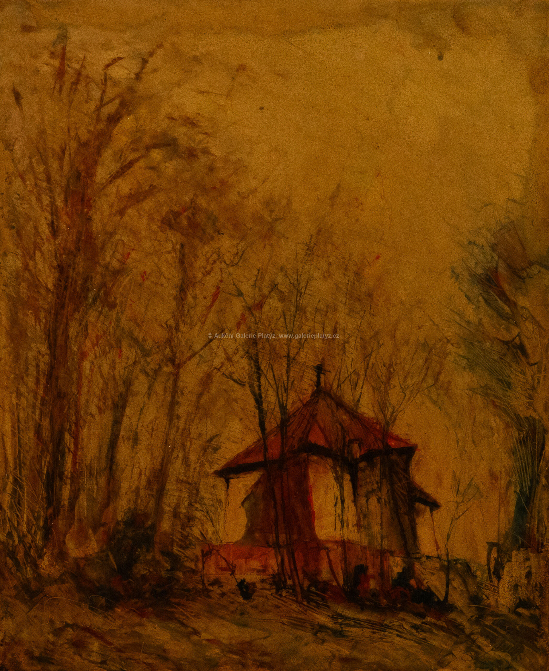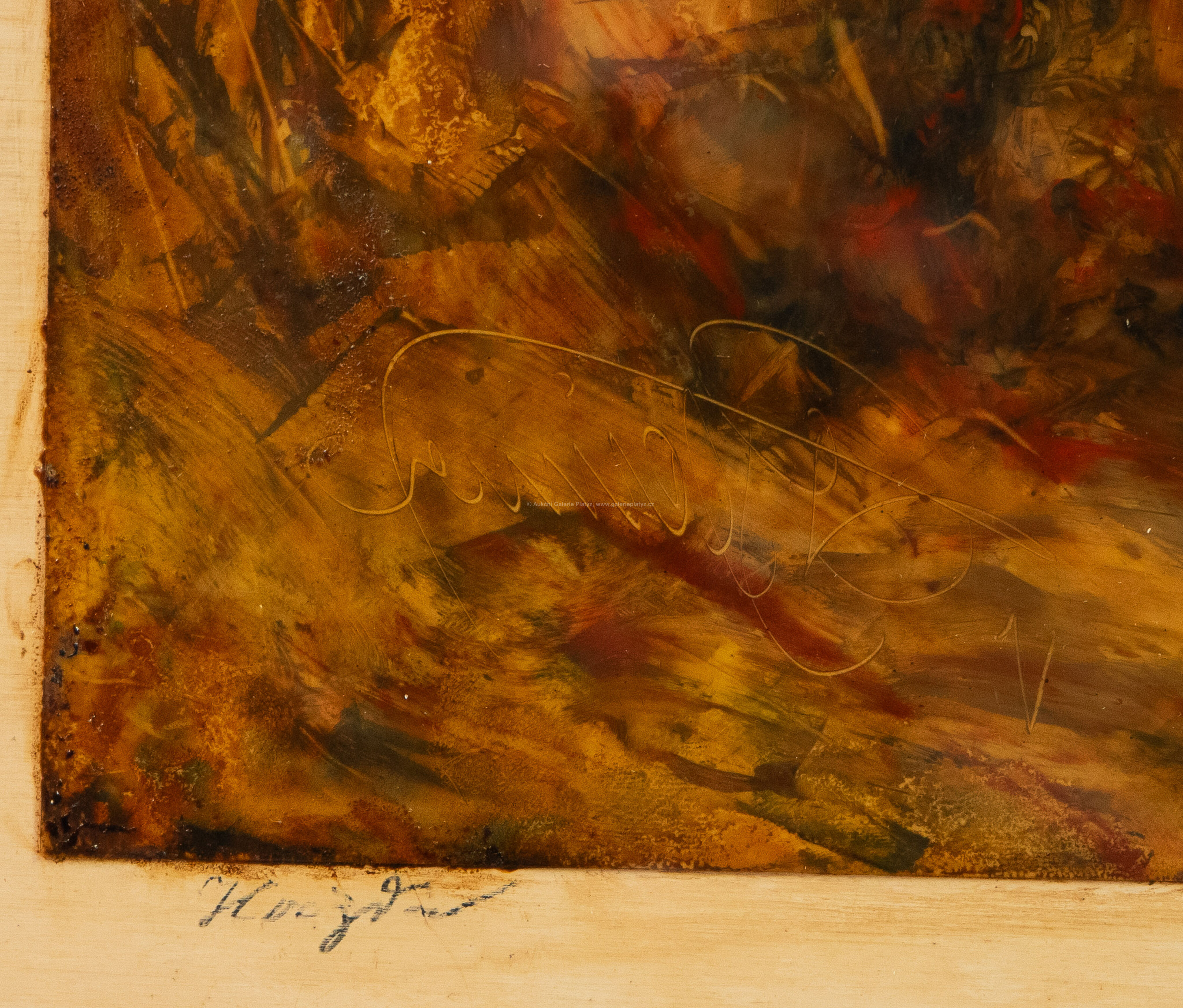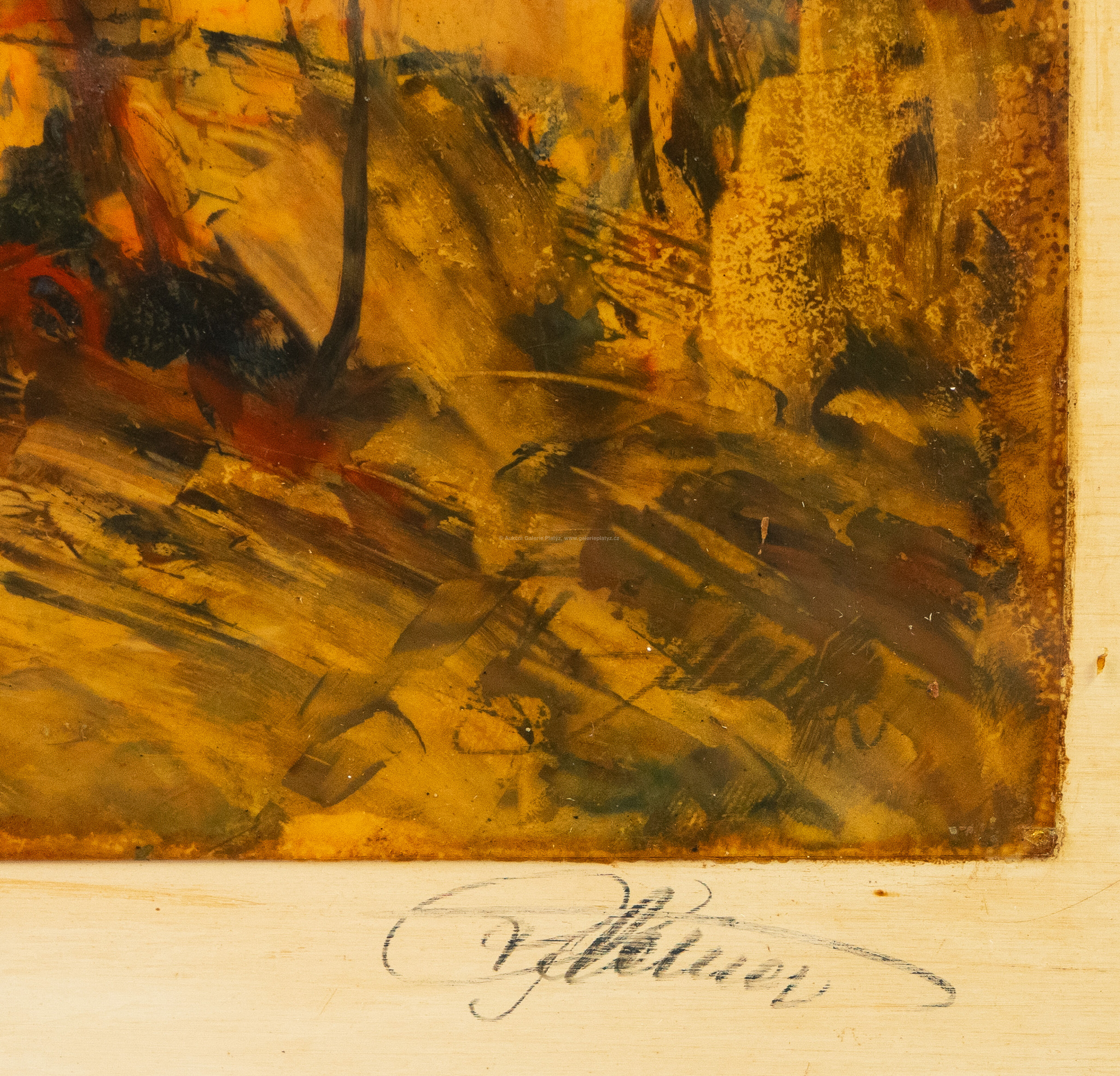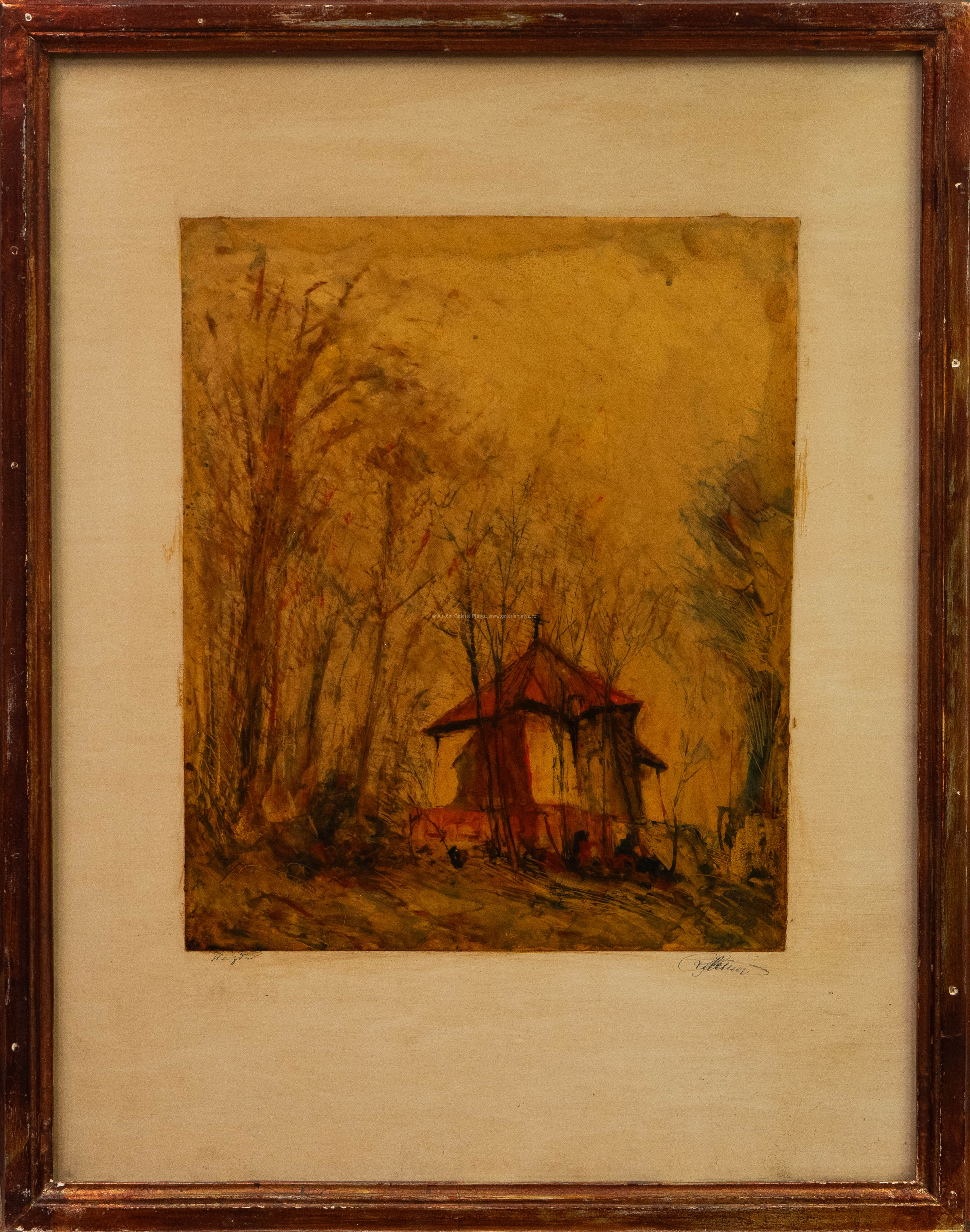 kombinovaná technika/PVC fólie, rozměr listu 38 x 31,5 cm, značeno a pospáno ve spodní části, zaskleno, rámováno, oděrky na rámu