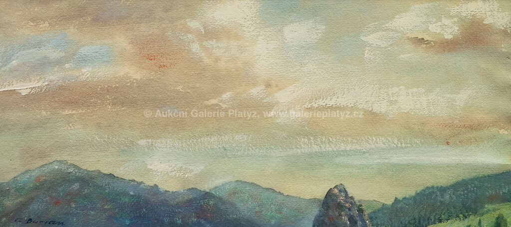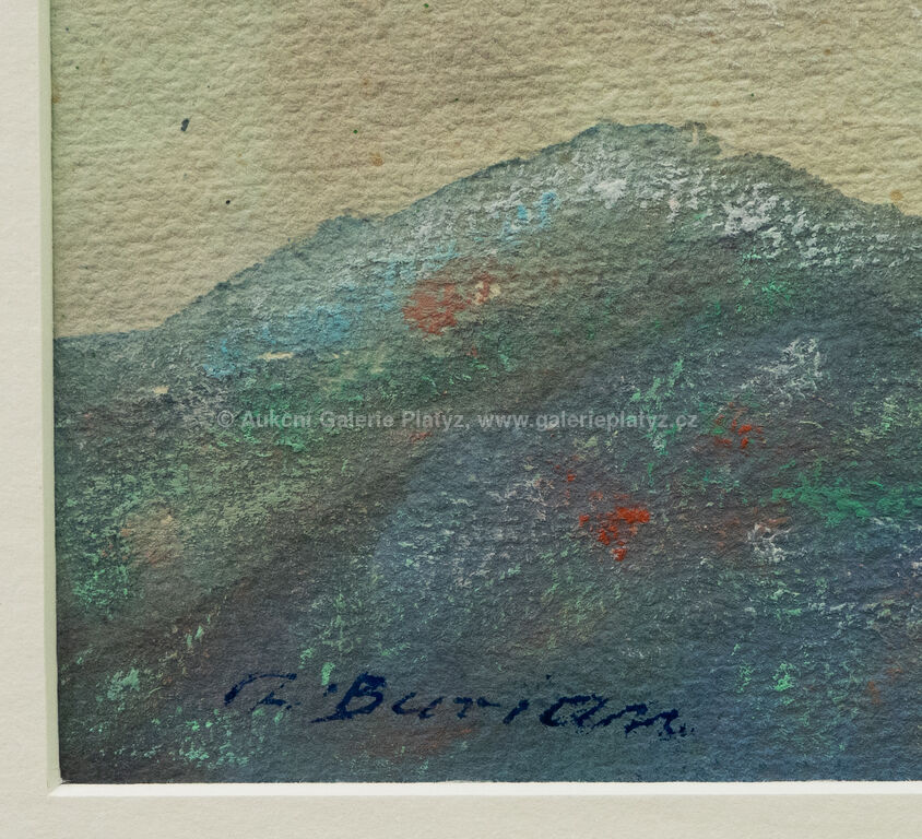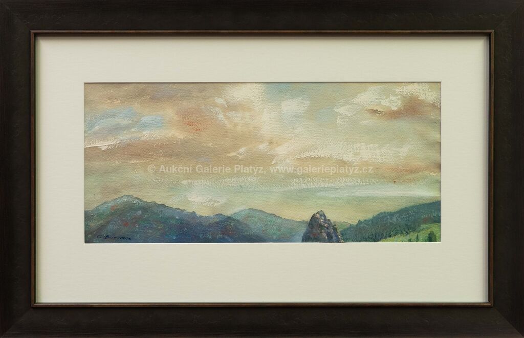 kvaš/papír, rozměr ve výřezu 20 x 45 cm, značeno vlevo dole, paspartováno, zaskleno muzeálním sklem, rámováno