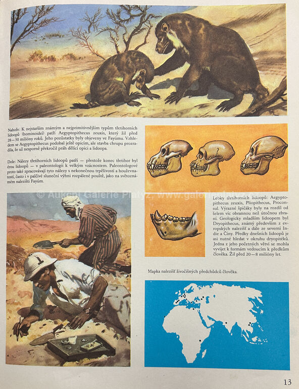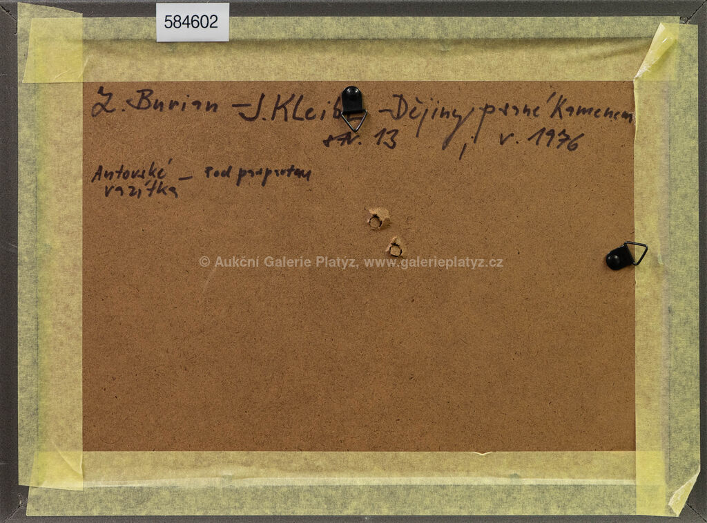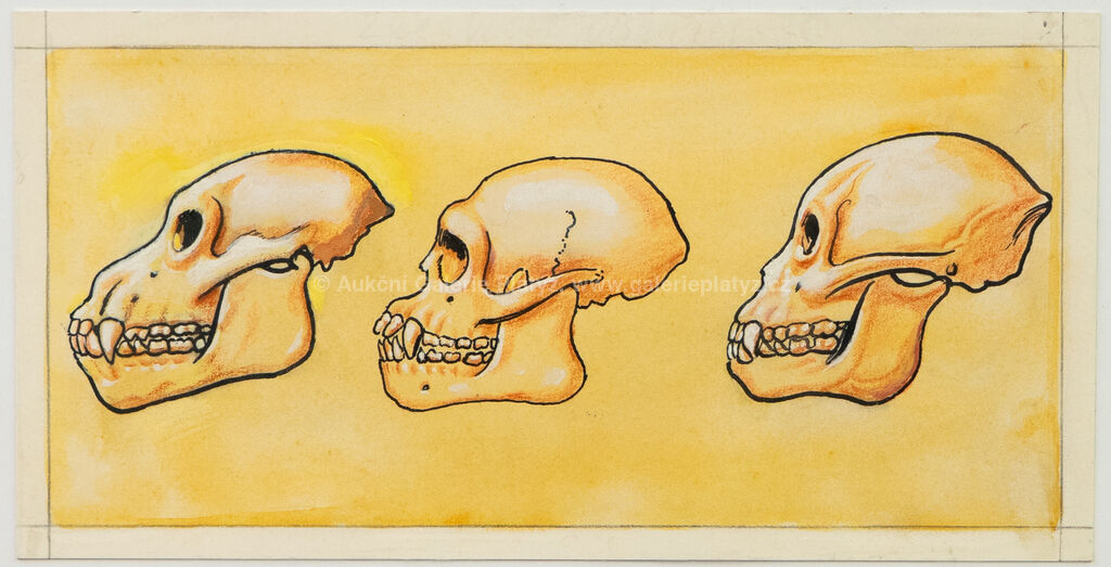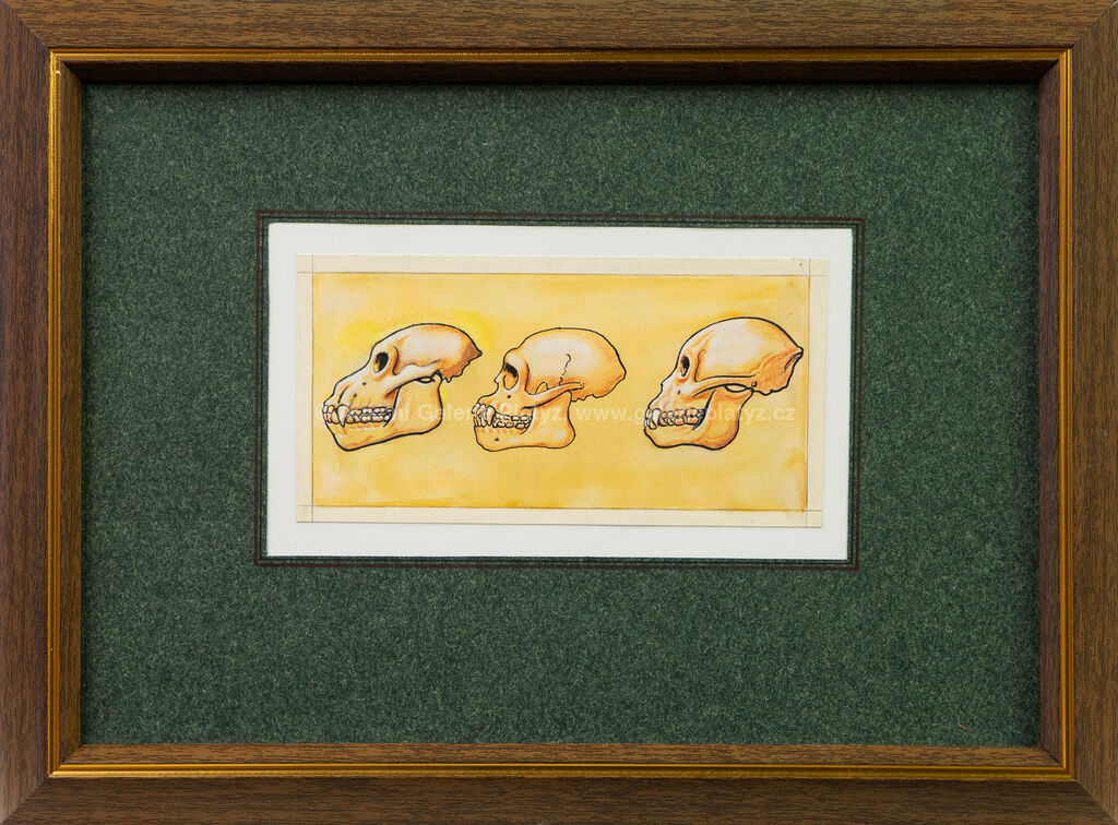 akvarel/tuš/papír, rozměr listu 8 x 16 cm, značeno autorským razítkem ve spodní části, zaskleno, rámováno, ilustrace z knihy Dějiny psané kamenem, J. Kleibl, vyd. 1976 (str. 13)