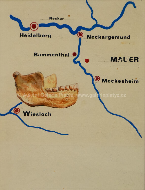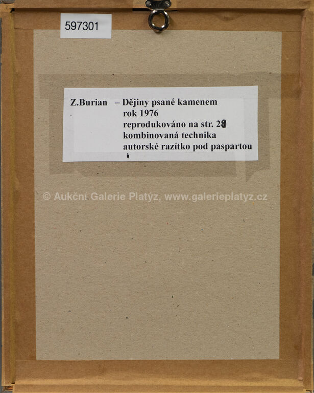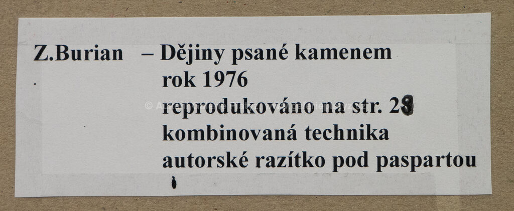 kombinovaná technika/pastel/papír, rozměr ve výřezu 17 x 13 cm, neznačeno, paspartováno, zaskleno, rámováno, publikováno v knize Dějiny psané kamenem, vyd. 1976